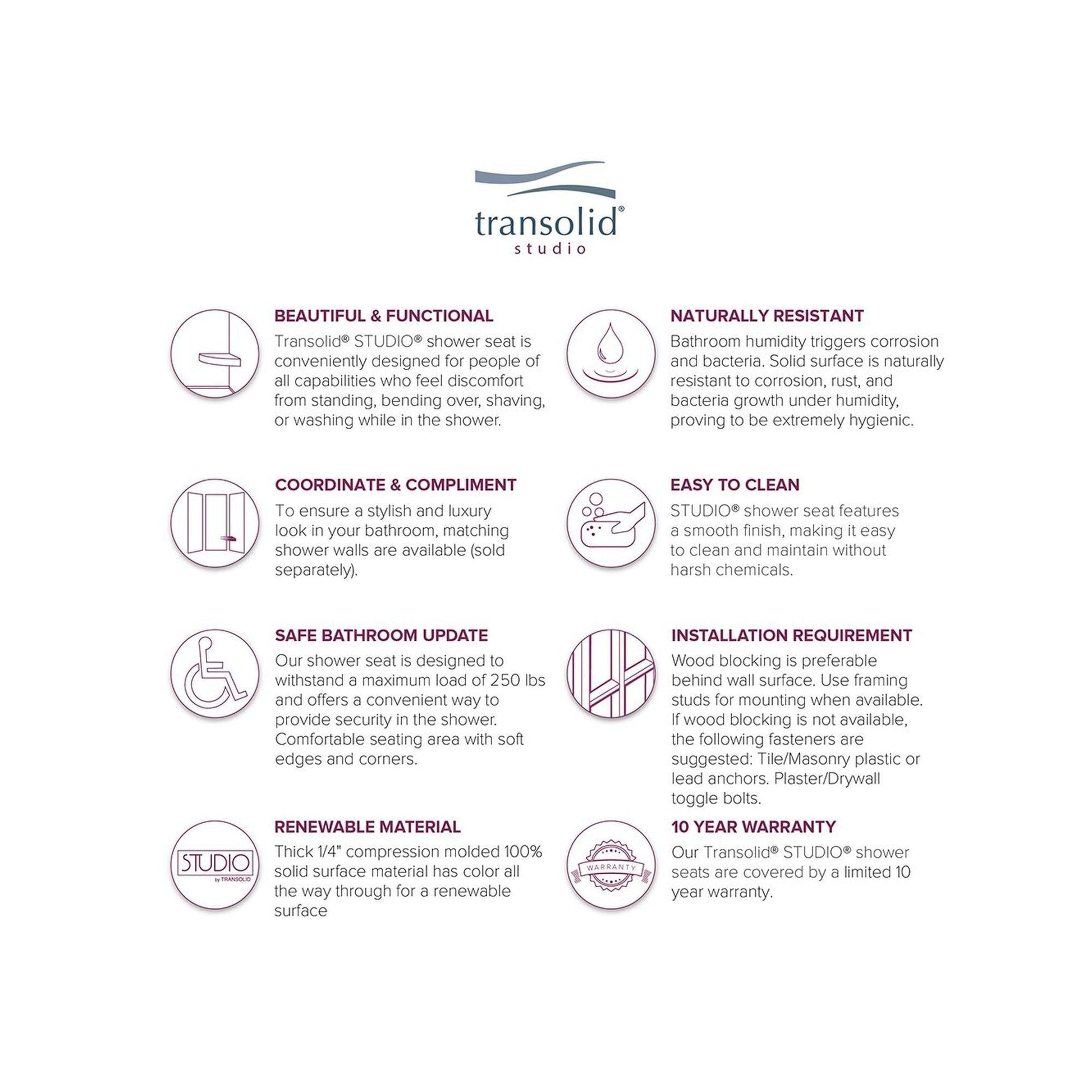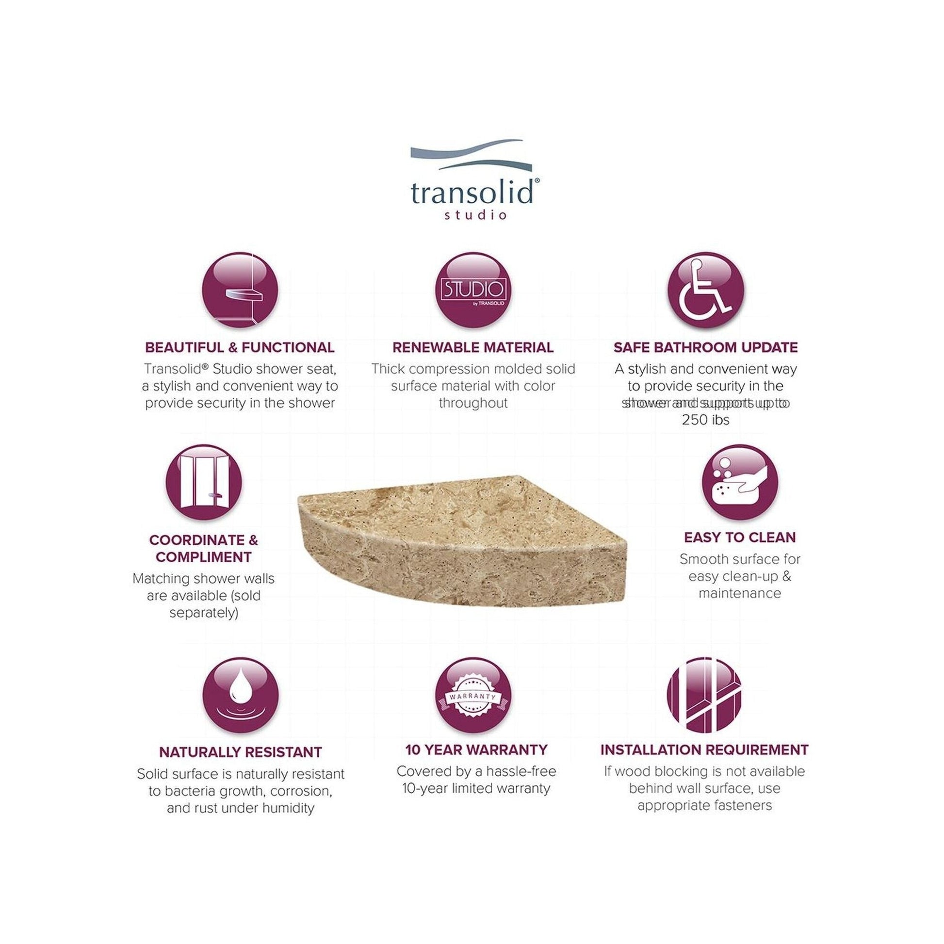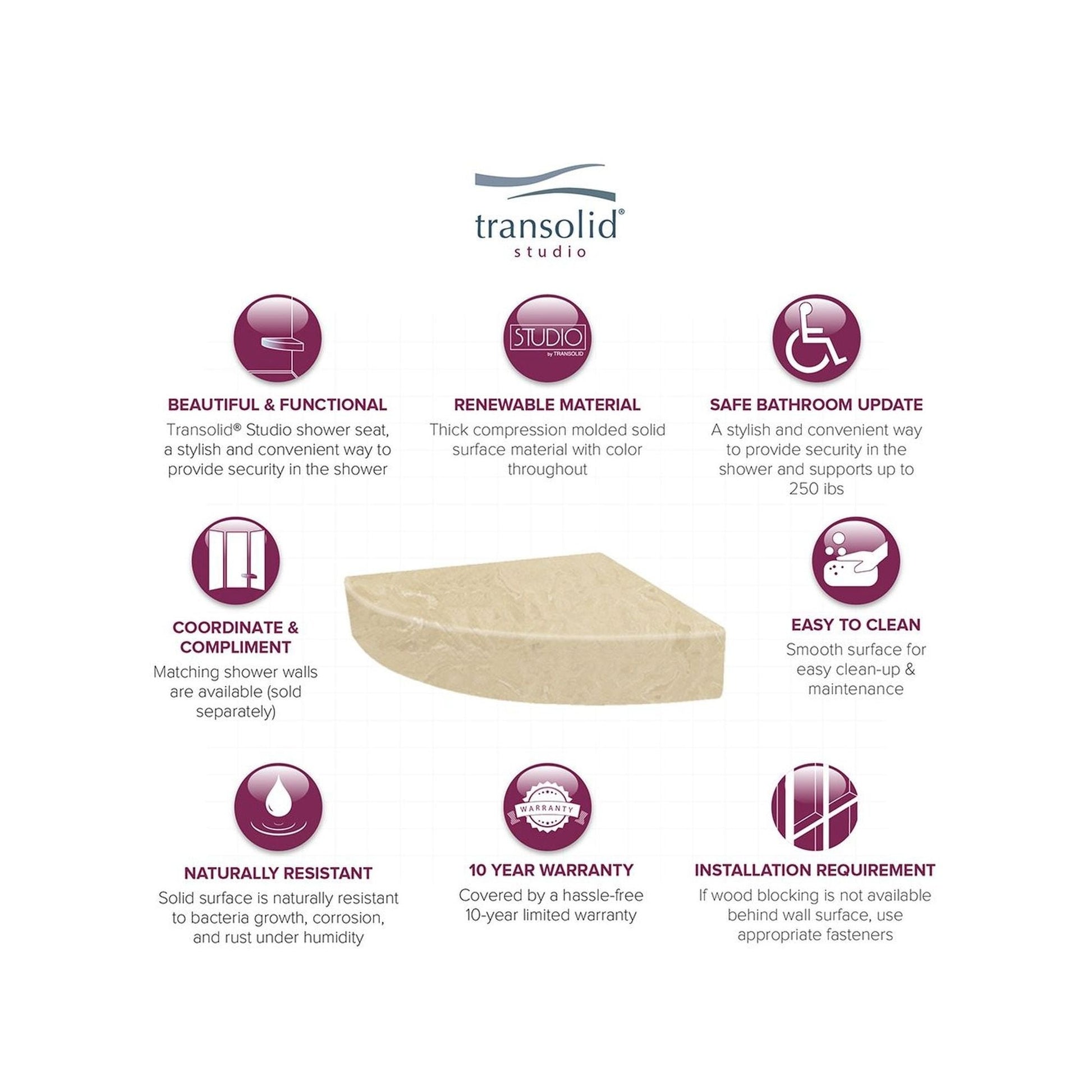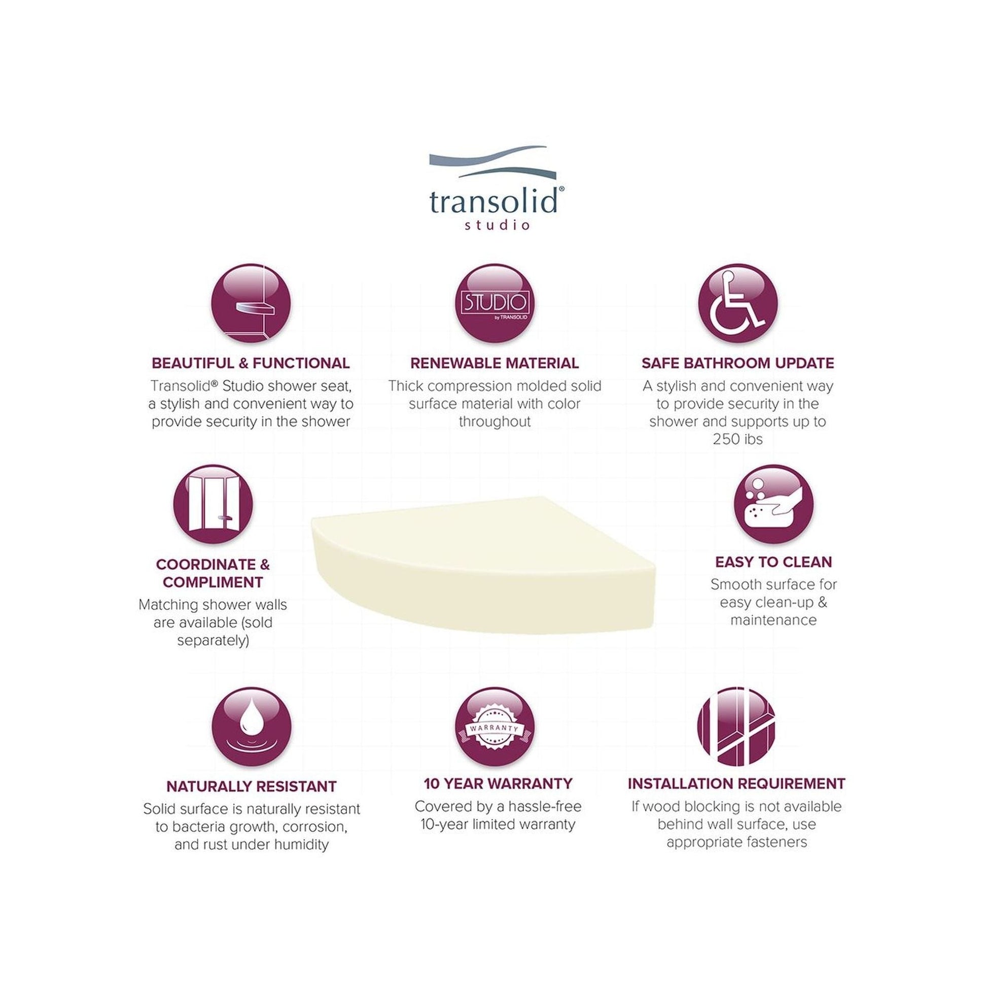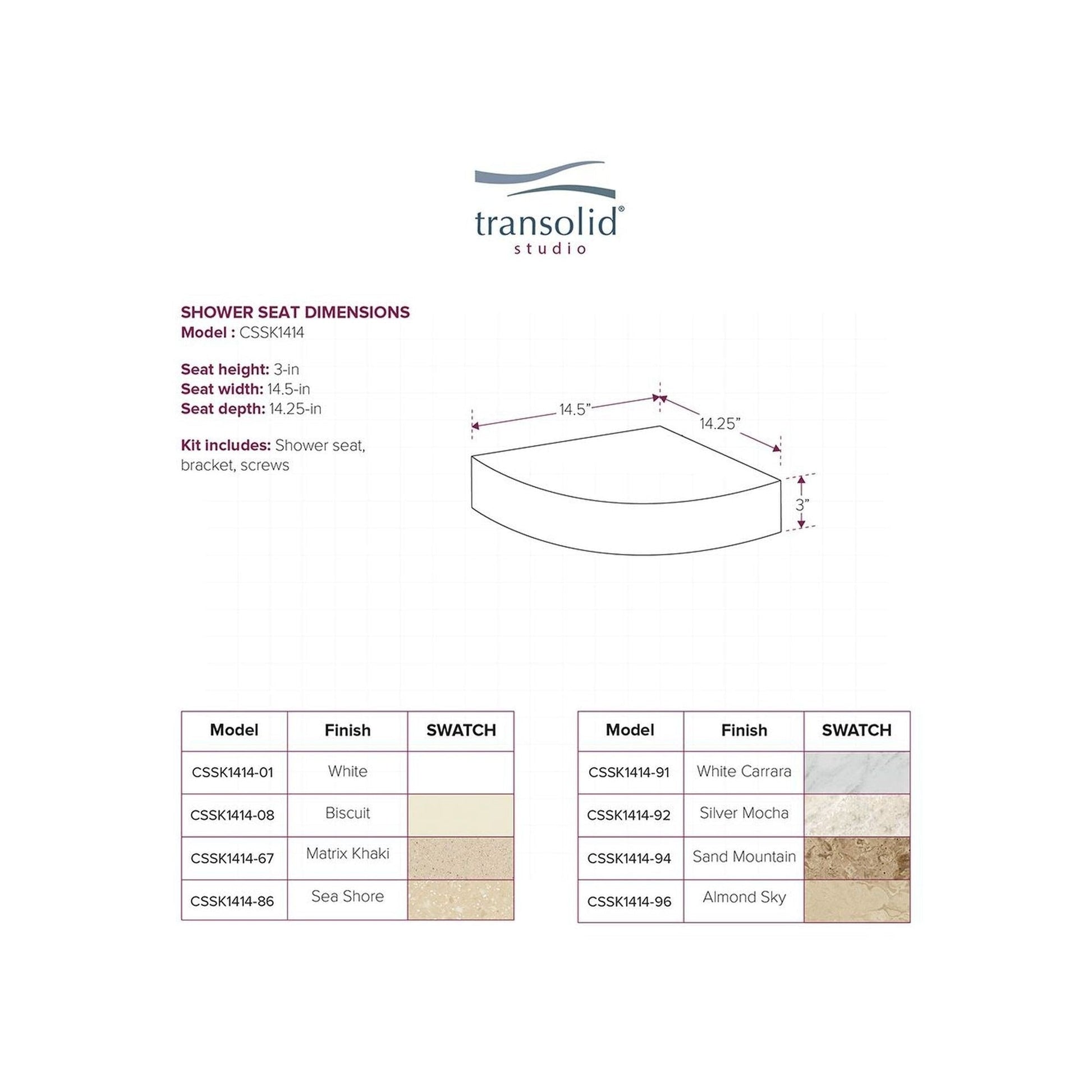 Siège de douche d'angle mural en surface solide Transolid Studio 14 po x 14 po - 14,5 po x 14,25 po x 3 po