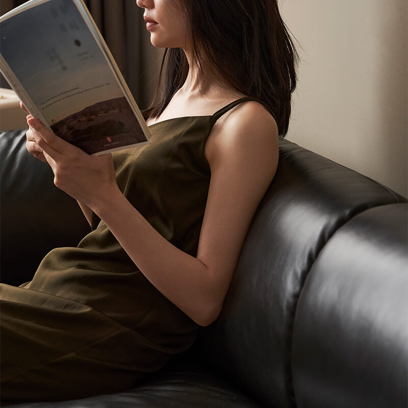 Les angles du canapé offrent un soutien moelleux, idéal pour se lover confortablement. Les accoudoirs, aux courbes naturelles et arrondies, offrent un soutien confortable aux coudes. À l'intérieur des accoudoirs, un cadre en bois massif offre un soutien robuste, idéal pour s'adosser occasionnellement.