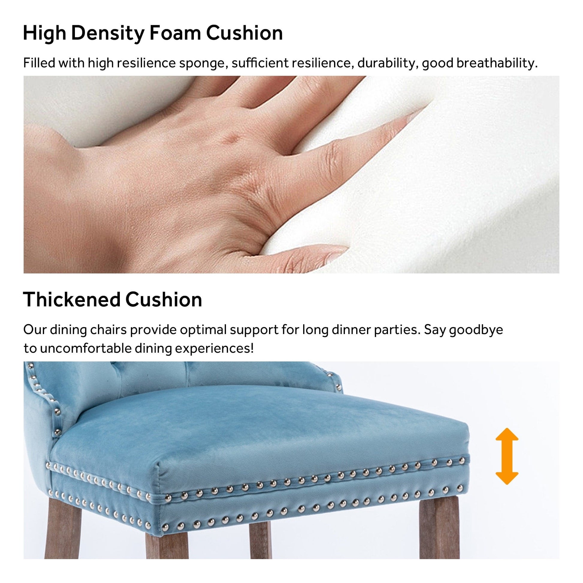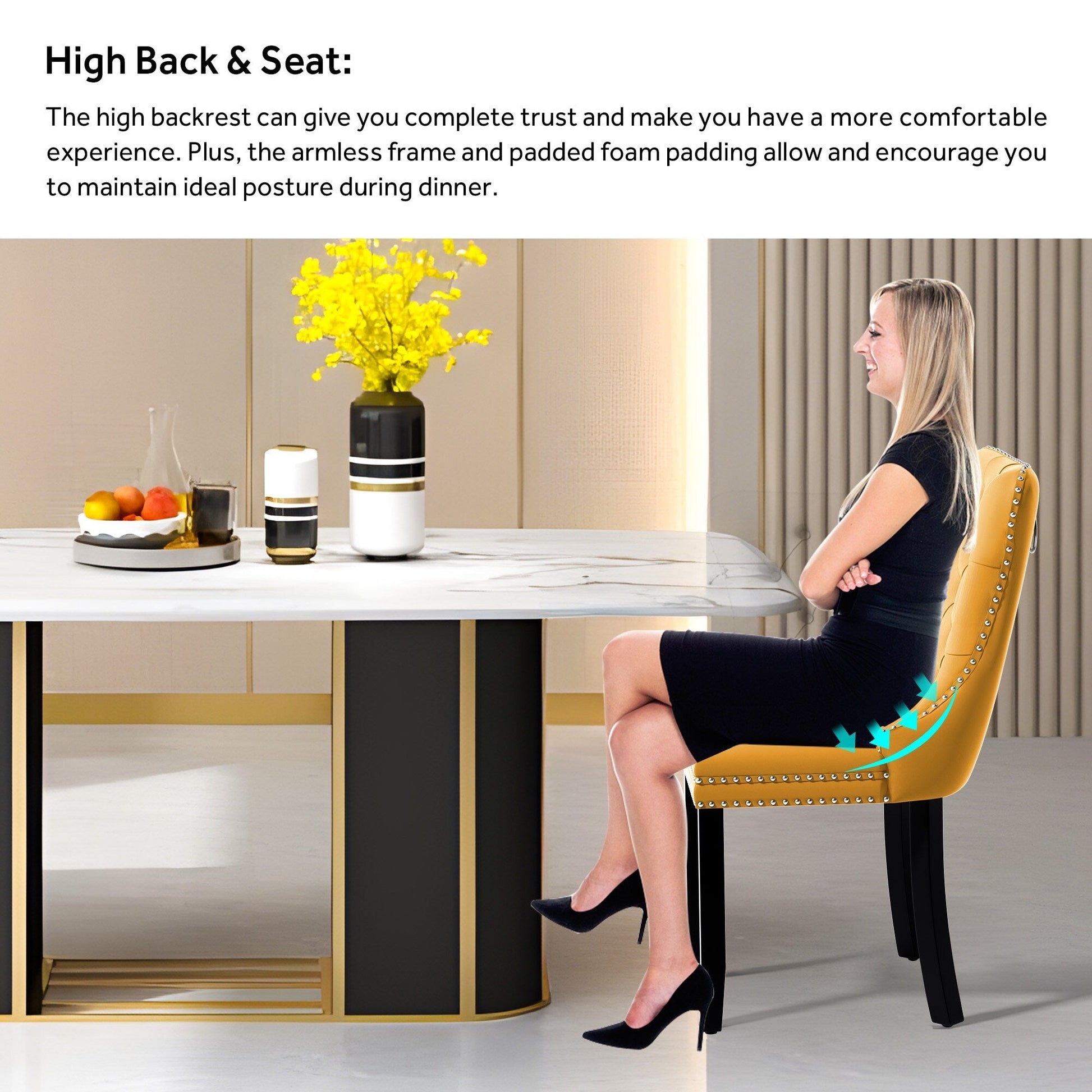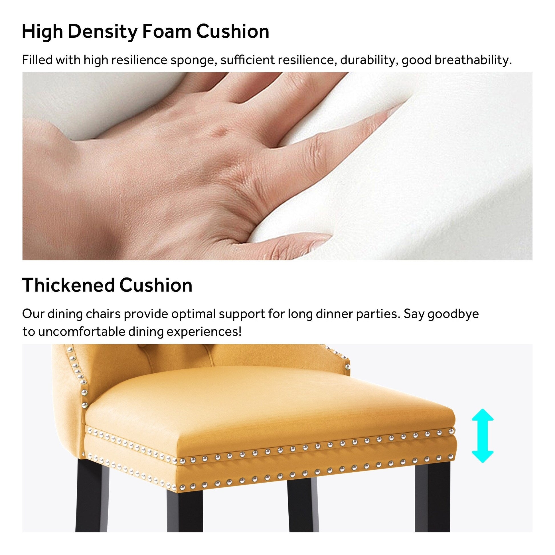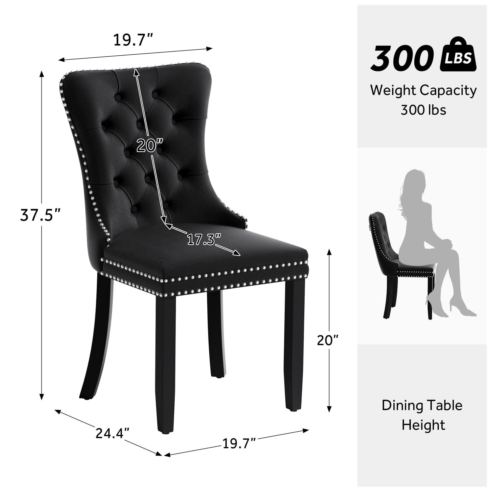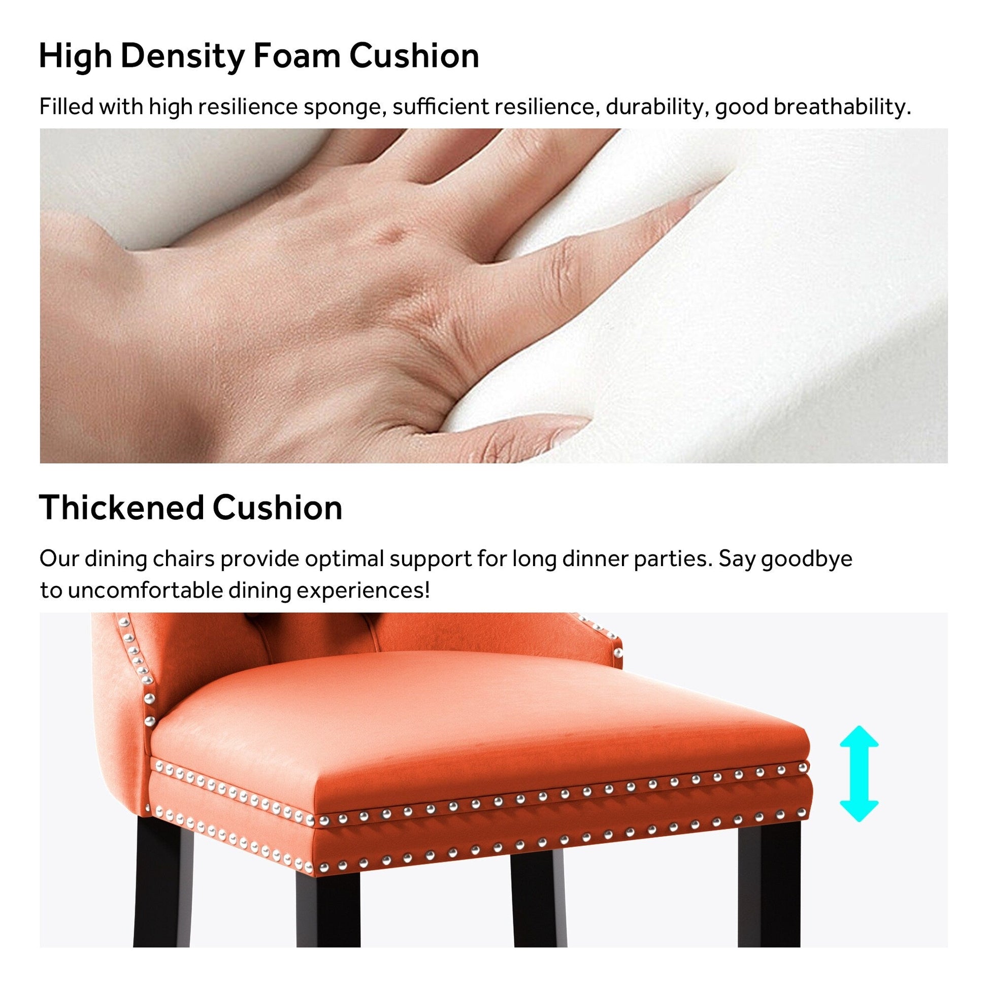 Ces chaises de salle à manger à oreilles sont confectionnées en velours de haute qualité, extrêmement résistant à l'usure et inaltérable. Le tissu, épais et luxueux, offre un toucher d'une grande finesse. Cet ensemble de chaises de salle à manger en velours arbore un style mid-century résolument moderne. Dotées d'un haut dossier, ces chaises assurent un excellent maintien du dos. Les nombreux rivets décoratifs incrustés autour du coussin et du dossier confèrent à l'ensemble une allure noble et élégante, et une impression de luxe raffiné. Nous fournissons une notice de montage et des vidéos explicatives. Pour toute question, n'hésitez pas à nous contacter.