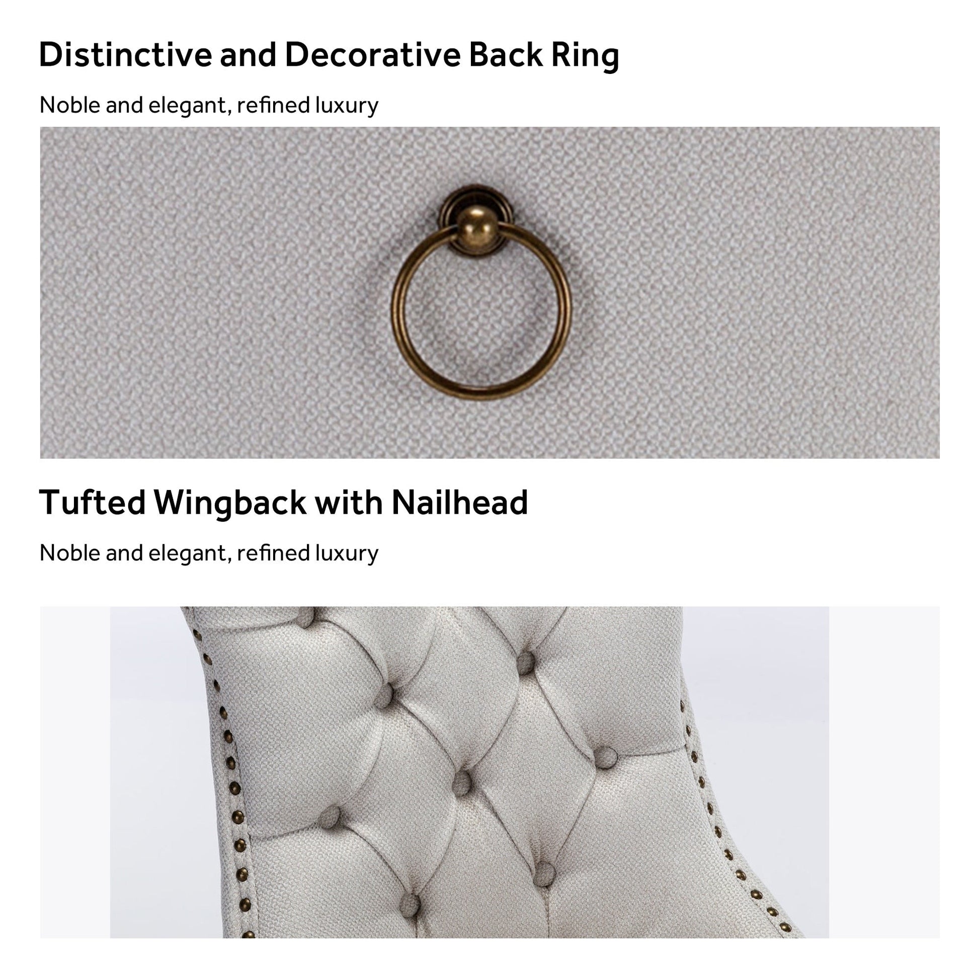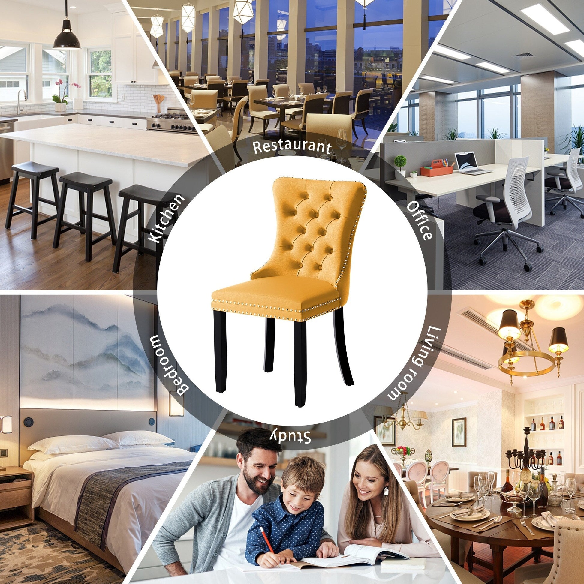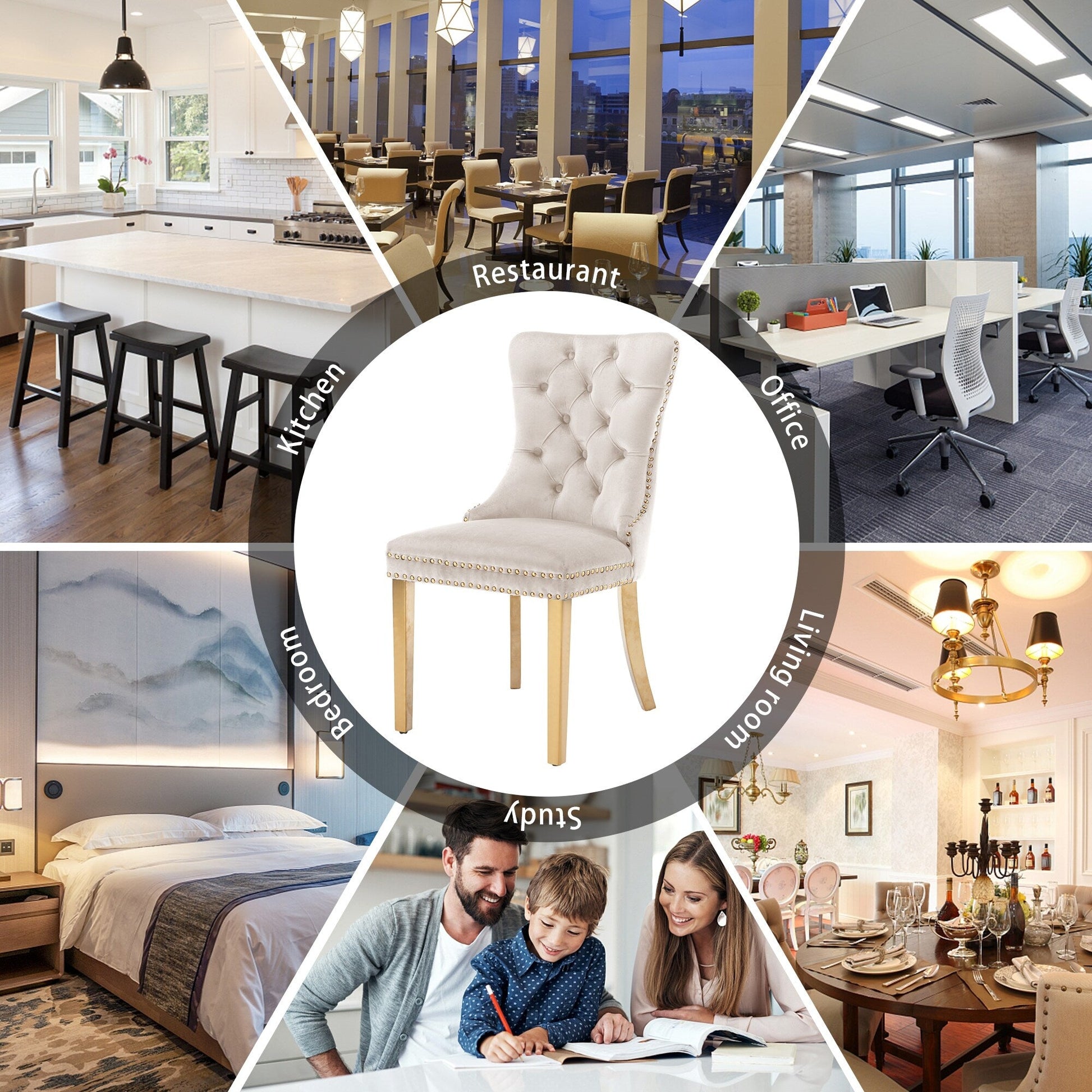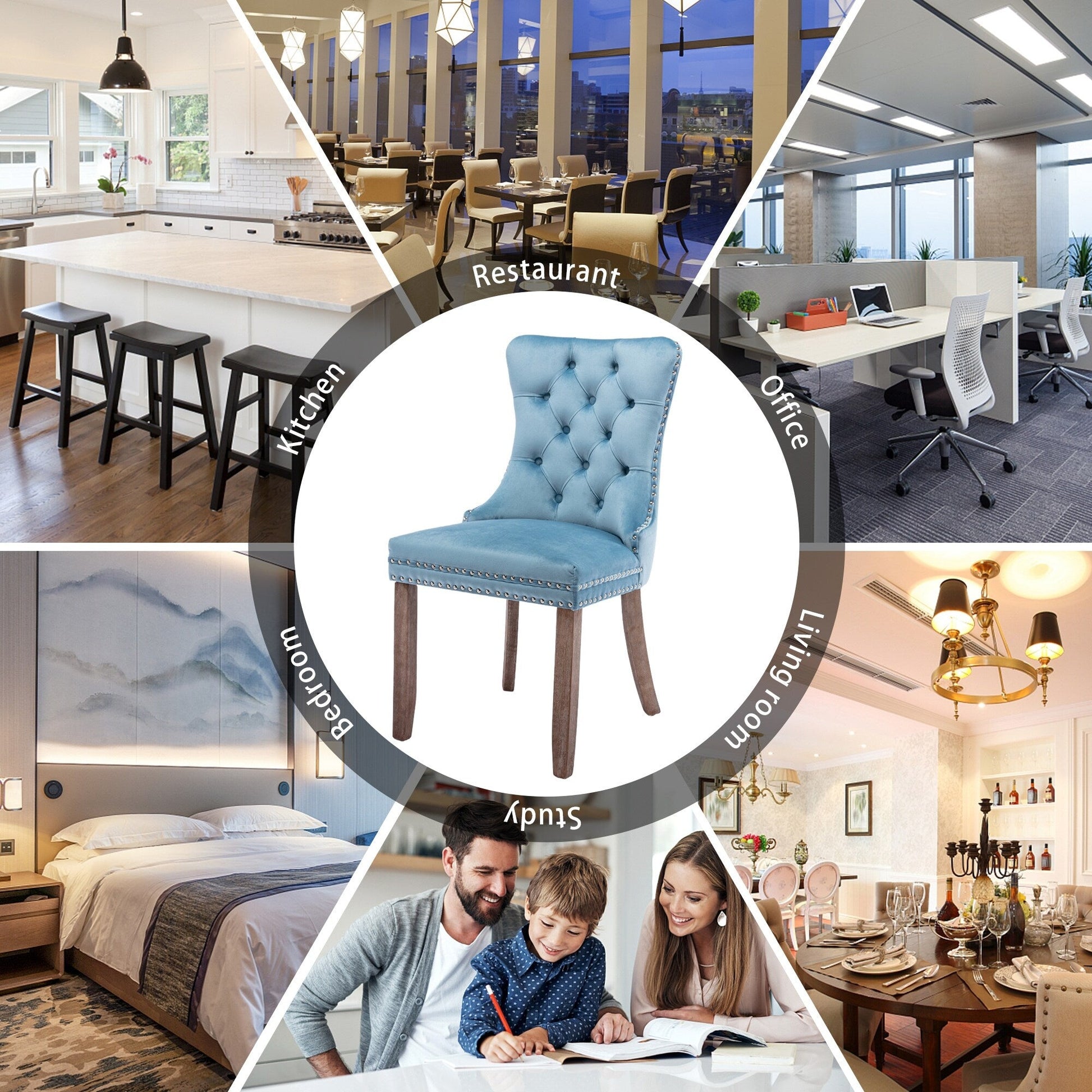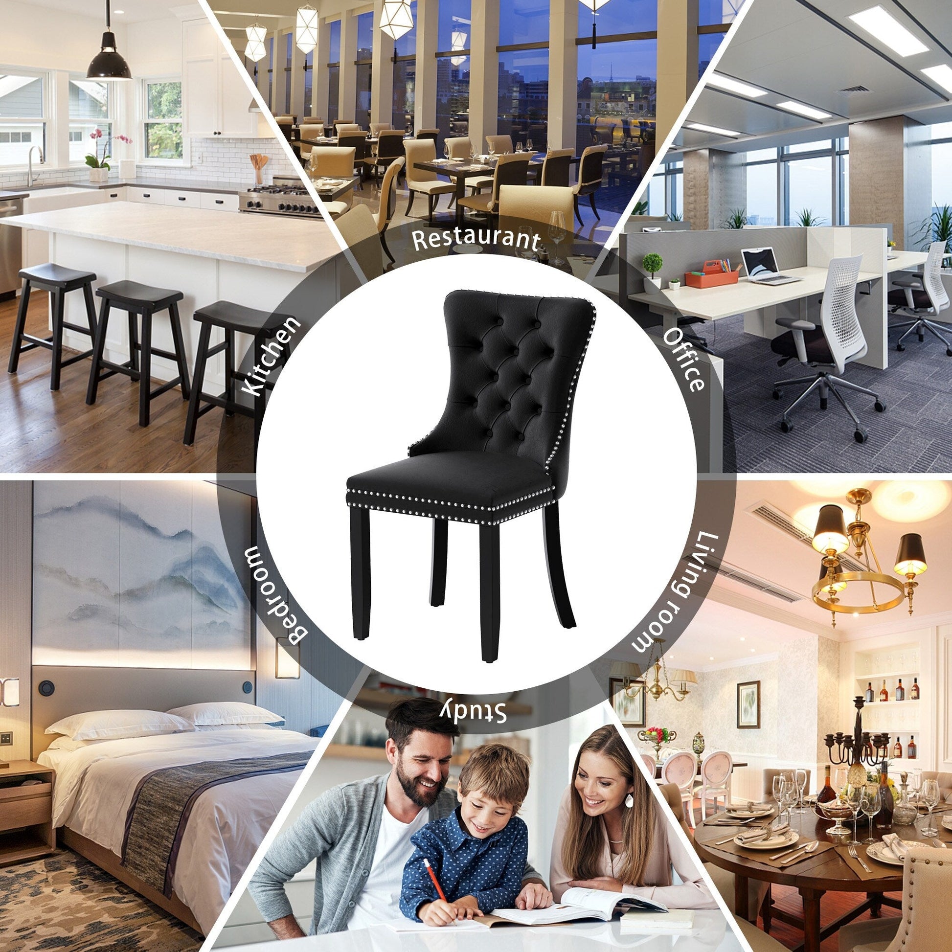 Ces chaises de salle à manger à oreilles sont confectionnées en velours de haute qualité, extrêmement résistant à l'usure et inaltérable. Le tissu, épais et luxueux, offre un toucher d'une grande finesse. Cet ensemble de chaises de salle à manger en velours arbore un style mid-century résolument moderne. Dotées d'un haut dossier, ces chaises assurent un excellent maintien du dos. Les nombreux rivets décoratifs incrustés autour du coussin et du dossier confèrent à l'ensemble une allure noble et élégante, et une impression de luxe raffiné. Nous fournissons une notice de montage et des vidéos explicatives. Pour toute question, n'hésitez pas à nous contacter.