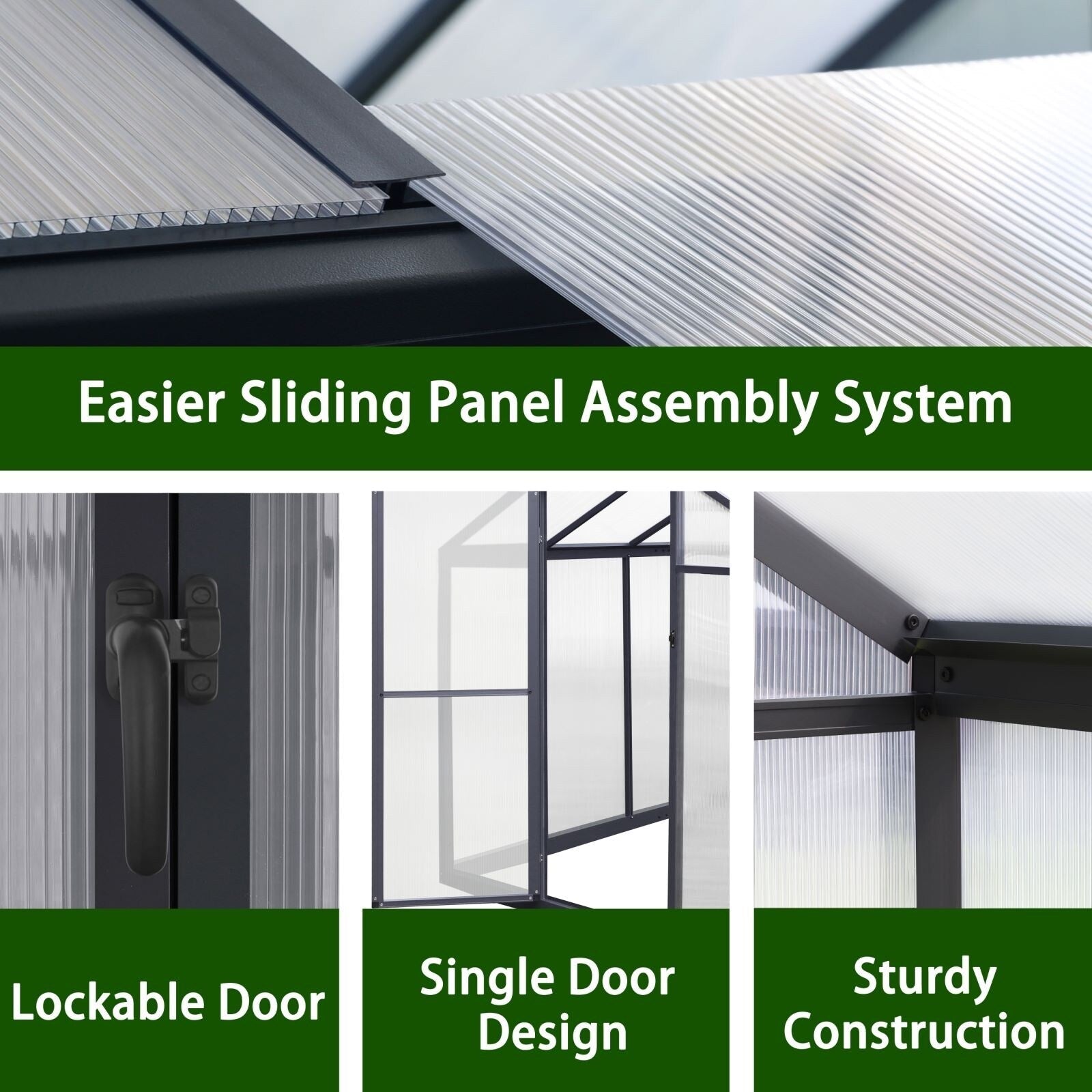 La serre en aluminium est équipée de panneaux en polycarbonate résistant aux UV qui protègent vos plantes des rayons UV nocifs et assurent leur croissance optimale. Grâce à cette caractéristique, vos plantes s'épanouissent toute l'année, quel que soit votre emplacement.