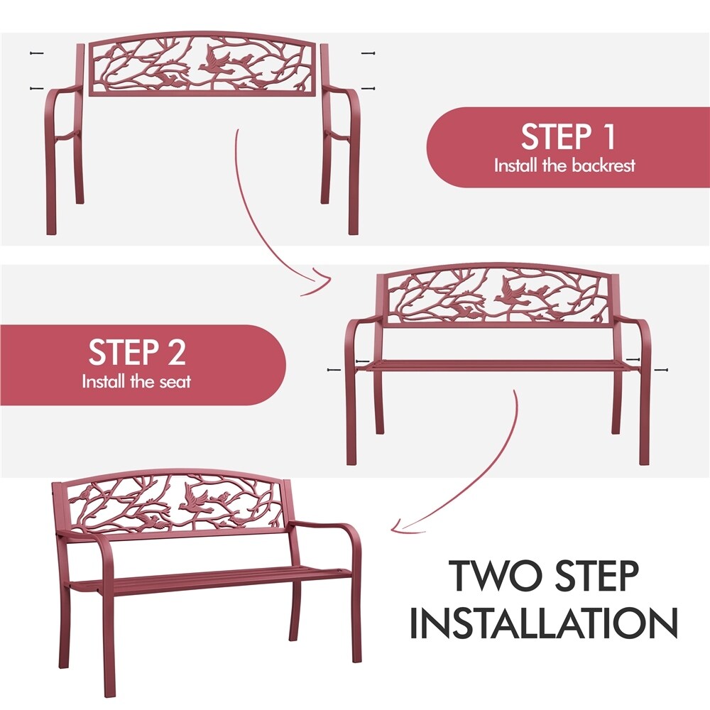 Apportez une touche de nature à votre espace extérieur avec notre banc de jardin Yaheetech de 15 m. Le motif d'oiseaux vintage du dossier embellit votre espace et favorise la circulation de l'air, tandis que l'assise légèrement incurvée, large et profonde, offre un confort optimal. Fabriqué en fer robuste avec un revêtement imperméable protecteur, ce banc est conçu pour durer et résister à une utilisation intensive. Supportant une charge maximale de 180 kg, il convient parfaitement aux parcs, jardins, cours, mariages et bien plus encore. Les accoudoirs incurvés assurent un confort optimal, et l'assise, avec ses rayures verticales, favorise la circulation de l'air et une répartition idéale du poids. Sa finition résistante aux intempéries garantit sa durabilité quelles que soient les conditions climatiques, et son montage est simple grâce aux outils et instructions fournis.